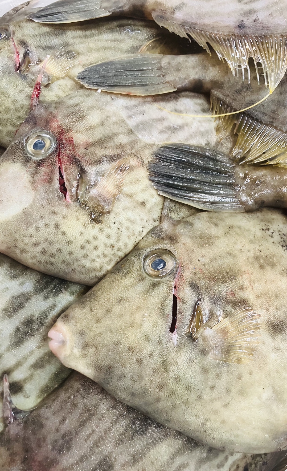 『活〆本カワハギ』 とっても久しぶりですが、 『活〆の本カワハギ』が市場へ入荷して来ました♪ 一般的な「本カワハギの旬」と言われている季節としては後半には入っているのですが、 勿論「肝」は美味しいのですが爽やかな「白身」も美味しいのが「本カワハギ」です♪ 一般的に多く流通している「カワハギ」の種類の「ウマズラハギ」とは別格の美味しさが 「本カワハギ」です♪ 実際なかなかお目に掛かる事の少ない「本カワハギ」。 この機会に美味しく頂きましょう♪ (⌒▽⌒)