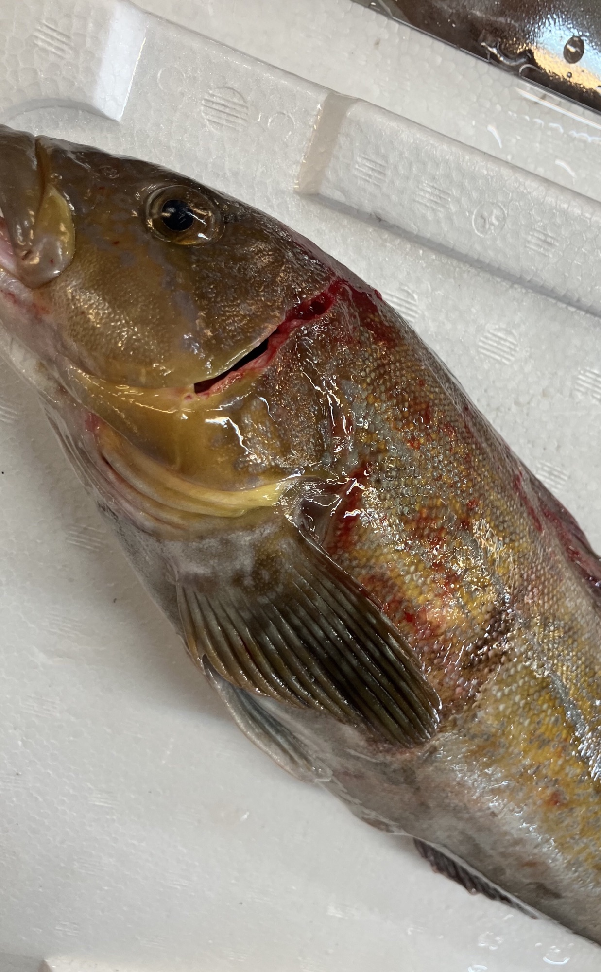 『七ヶ浜沖獲り黄金色の活〆アイナメ』 七ヶ浜の「アイナメ」もいよいよ冬の産卵期に入ってきたのでしょうか?♪ 黄金の婚姻色に輝く雄が「活物」で水揚げされて来ました♪ 勿論直ぐに「活〆」です。 脂ののった「婚姻色に輝く冬の雄アイナメ」の味をお刺身で楽しみましょう♪ ちなみに♪ 今朝も「釣りドンコ」が水揚げされてきましたが一緒に「活〆カワハギ」もきたので、 今日は「ドンコとカワハギの肝味比べ」でも楽しんで頂きたいと思います♪ \(^o^)/