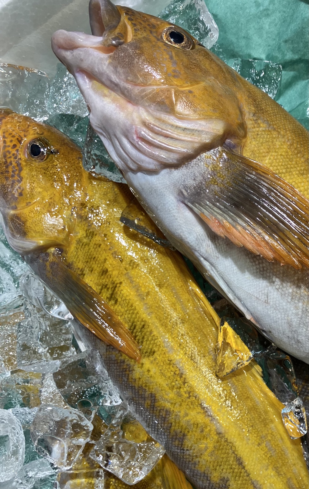 『黄色アイナメ』 この時期ならでは。 表面が婚姻色の黄色に輝く「雄のアイナメ」。 旨味タップリの『黄色アイナメ』となります♪ (^∇^)