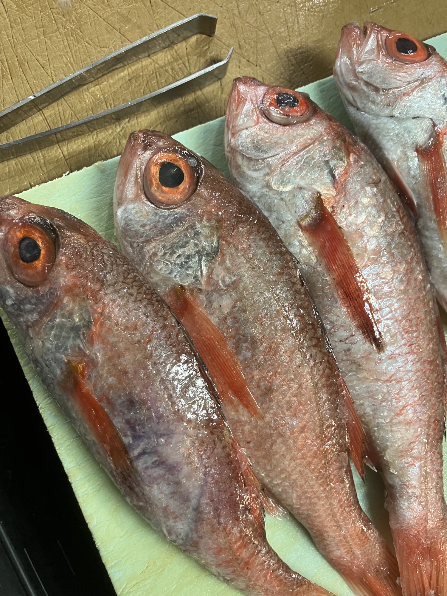 『金華山沖獲り赤ムツ』 宮城県金華山沖から『赤ムツ』が漁れて来ました♪ 島根や富山、石川、新潟等の沿岸物が一般的に知られている別名が「ノドグロ」と呼ばれているのがこの「赤ムツ」です♪ 上品で旨味のある脂はなかなかですね♪(^∇^)
